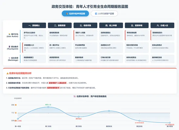 应用行为轨迹追踪法与服务体验蓝图工具,对青年群体在物理空间与政务服务系统中的高频交互触点进行解析,识别其在流入、就业、居住至长期定居周期内的服务阻滞环节。