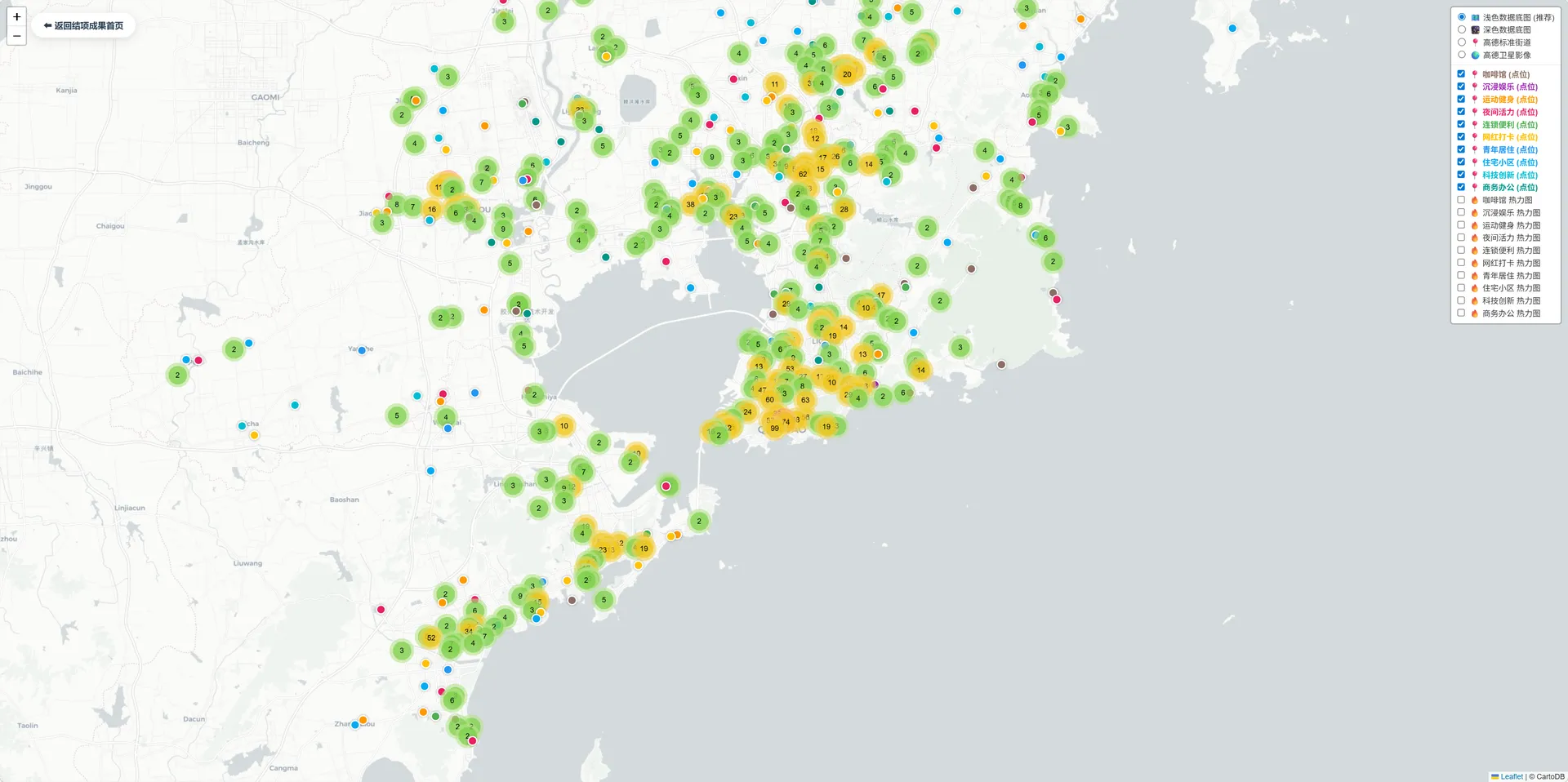 运用地理信息系统与空间分析技术,大范围采集城市公共设施的空间兴趣点数据。通过核密度估算法与空间叠置分析,测算青岛市青年群体的活动集聚度与空间分布规律。