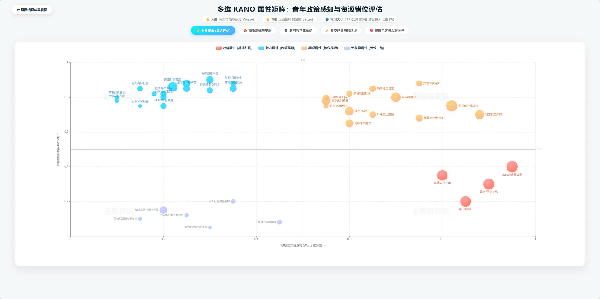 引入需求分类模型,面向高校毕业生、职场青年及新业态从业人员开展结构化问卷调查(有效样本473份),通过计算需求满意度系数与不满意度系数,确定各项城市公共服务与空间环境设施的资源配置优先级。